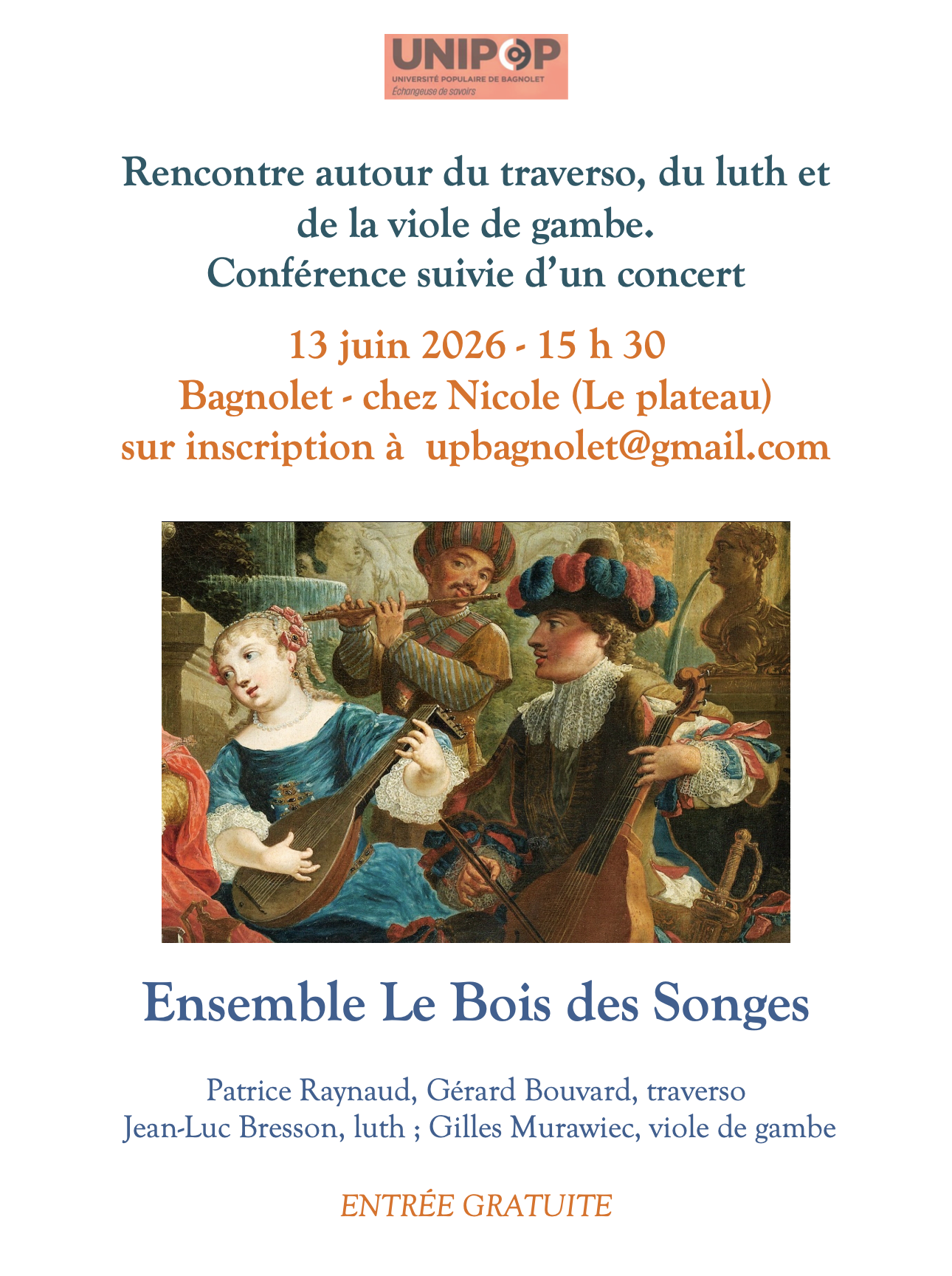 La formation Bois des songes nous proposera une réflexion sur le sujet au cours d'un concert le samedi 13 juin à partir de 15h, chez Nicole, quartier Le Plateau. Cette proposition découle de notre festival 2025 et de la conférence sur l'anatomie de la musique baroque de Jacques Caron, chef de chœur et d'orchestre.